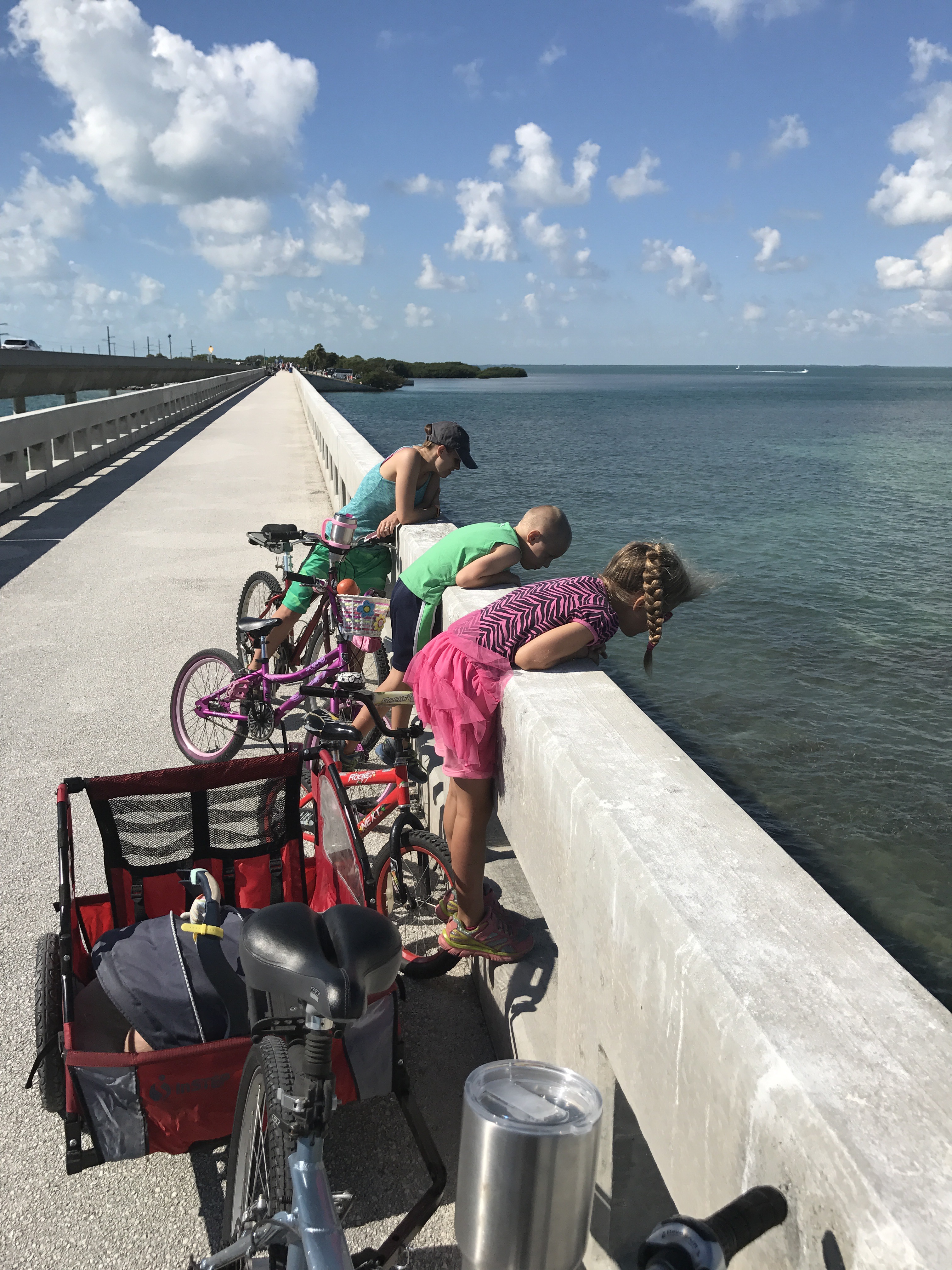 We explored Marathon Key and went to Veterans Memorial Park & beach. Vets Memorial park has a dog-friendly beach so our four-legged family member was able to come along. Dixie really enjoyed being on a long tie-out and went bounding through the waves along the beach. After a bit we decided to walk the length of the beach and started seeing…Man-of-war jelly fish. With a dog and two small children running around, this was a buzz-kill for us. We explored farther north/east along US-1 to another public beach, and were again greeted by Man-of-War jellyfish. Since both of these beaches were on the windward side of the keys we decided to return to the campground, which had a leeward beach, out of the path that the jellyfish would be blown up onto the beach. I took a good look up and down the beach and did not find one. Hurray, we were safe to play! The kids dug in the sand, waded in the shallow water, and explored as close as we allowed to the historic train bridge along the side of the beach. They also climbed the trees that shaded part of the beach. I was amused when they decided to “heal” the trees by putting sand over where there was sap coming from the trees. The sand stuck to the sap and created a “band-aid” according to the kids. Heather and I enjoyed our time at the beach both in the water and swinging in a hammock strung between the trees.