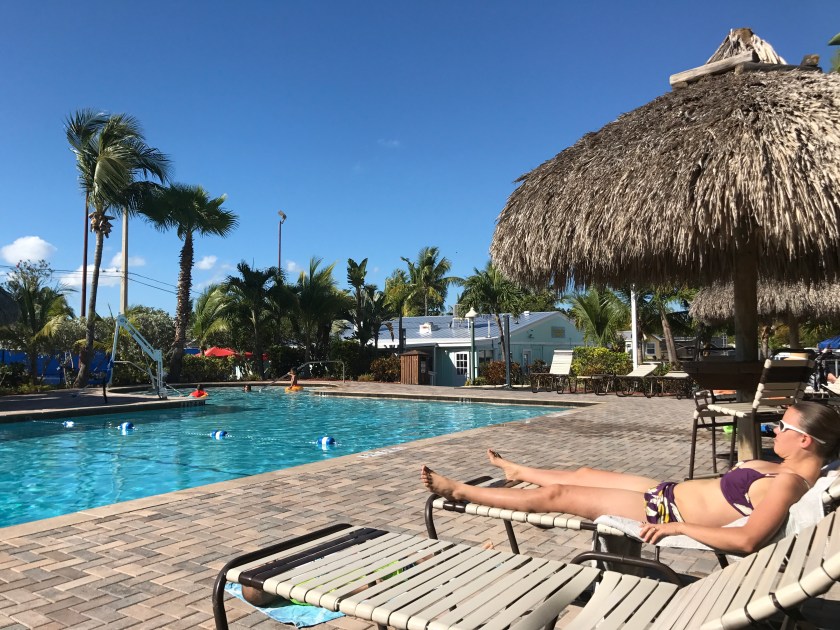 The campground had a very nice pool, complete with tiki hut shades over the poolside tables. There were plenty of lounge chairs to relax and catch some sun as well. We also took an interest in the local iguana that scampered from one end of the pool deck to the other and then back again.