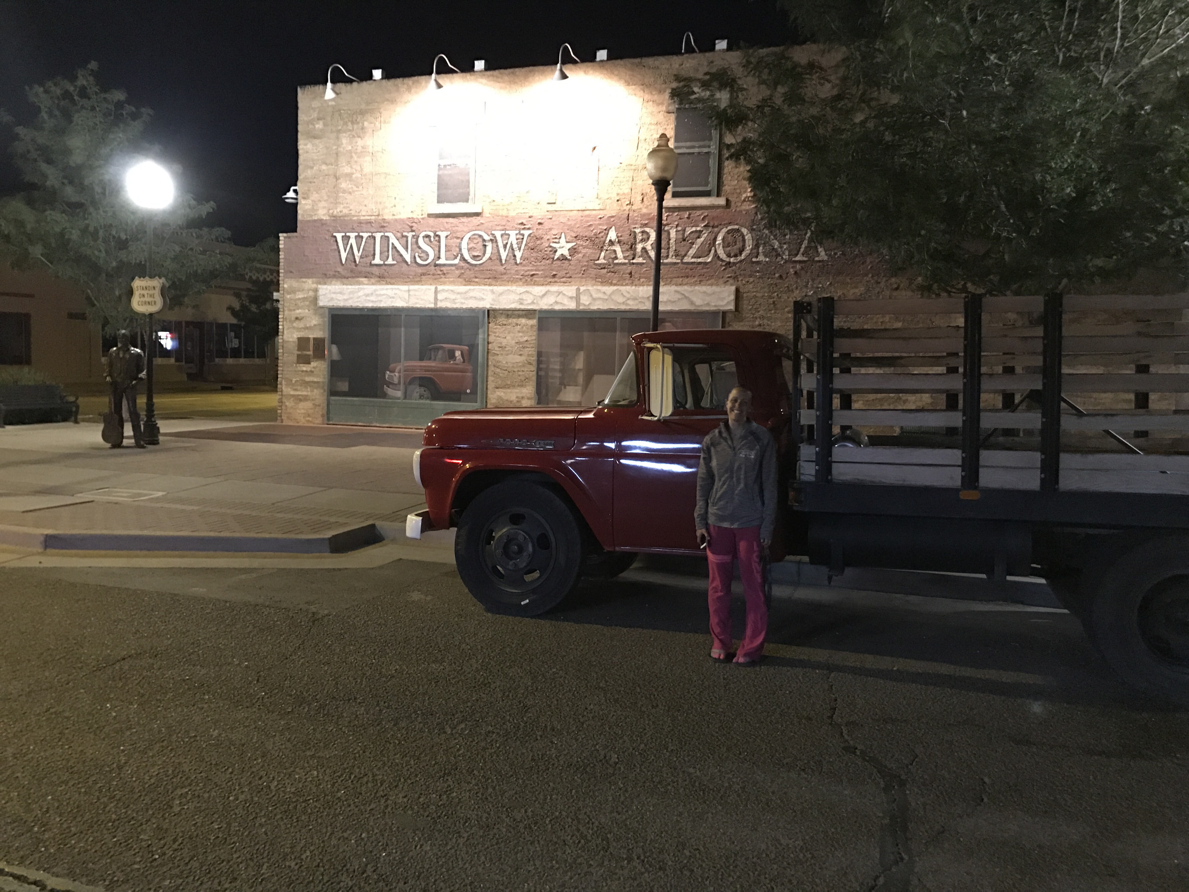 As we progressed east along I-40 we came upon the exit for Winslow, AZ. Being the geek that I am I convinced Heather to make the quick detour and snap some pictures before finding a place to sleep for the night. The kids were asleep in the vehicles, so we left them sleep and enjoyed a late night stroll around Standin’ on the Corner Park by ourselves. I especially liked the giant route 66 logo painted on the pavement in the middle of the intersection as well as the “reflection” of the flatbed Ford in the window. For those of you who have not been there, there truly is a flatbed Ford parked along the street; however the “reflection” in the window is actually on the inside of the glass and not a true reflection at all.
