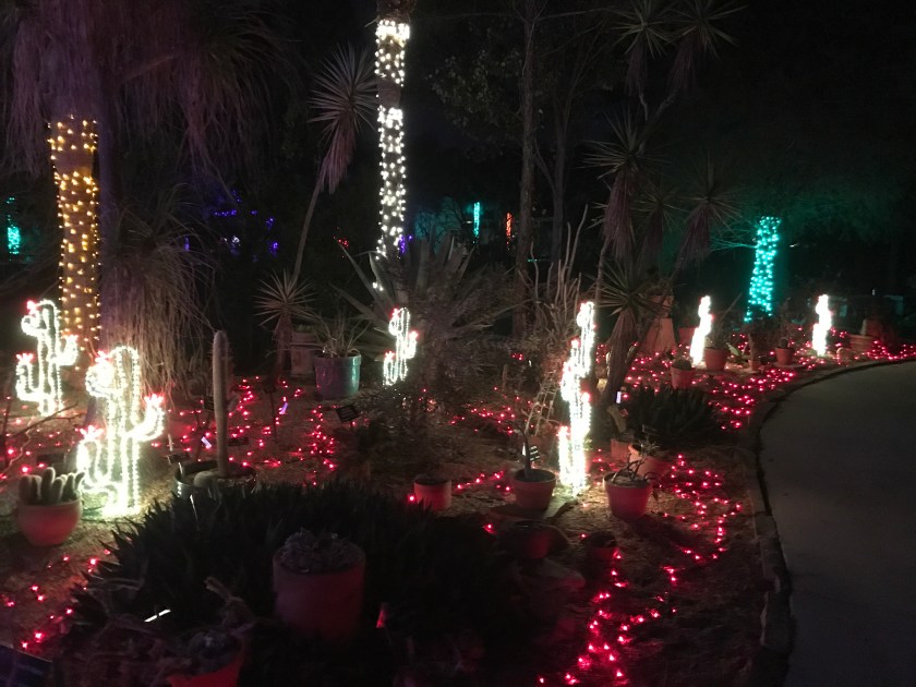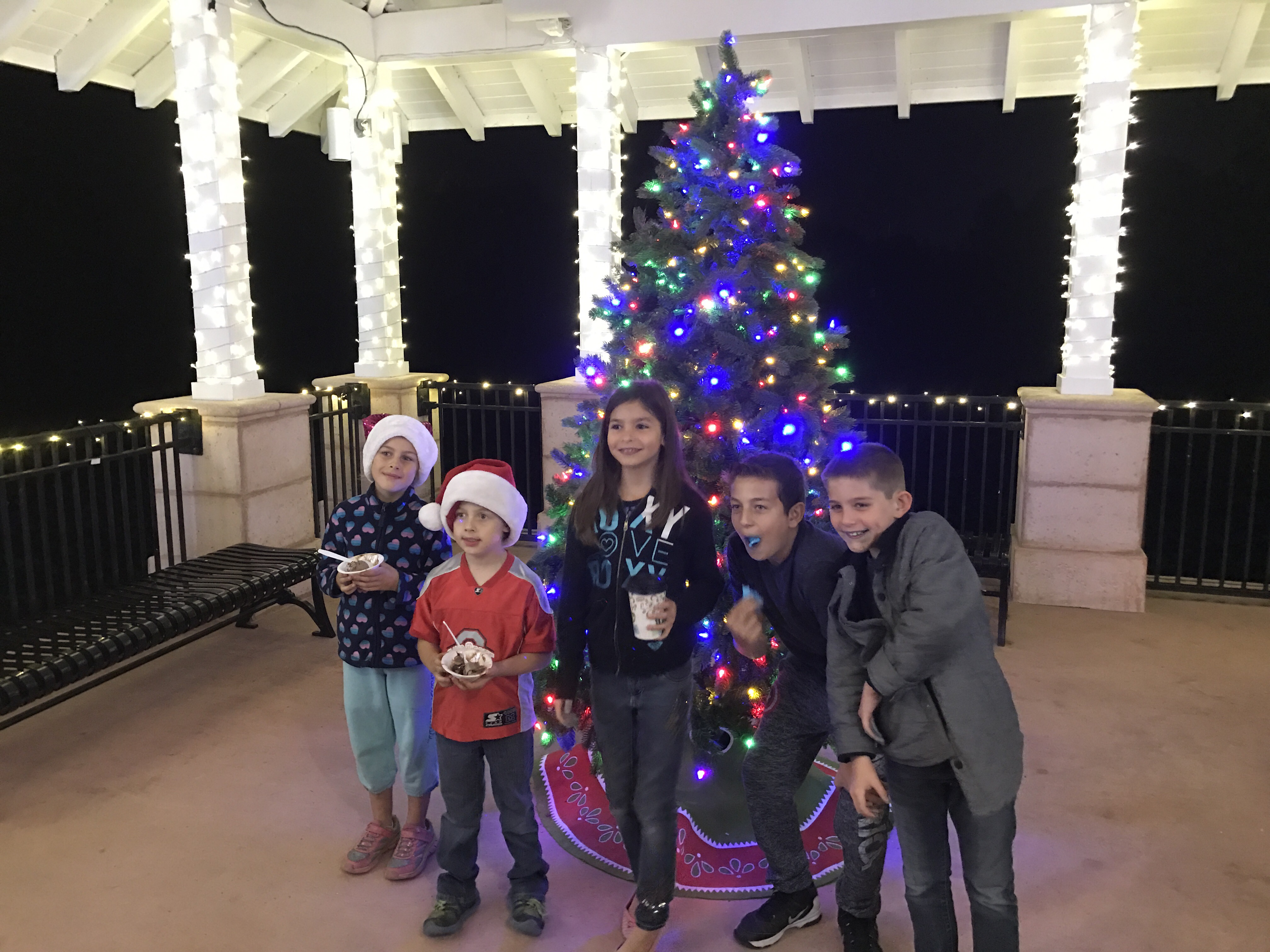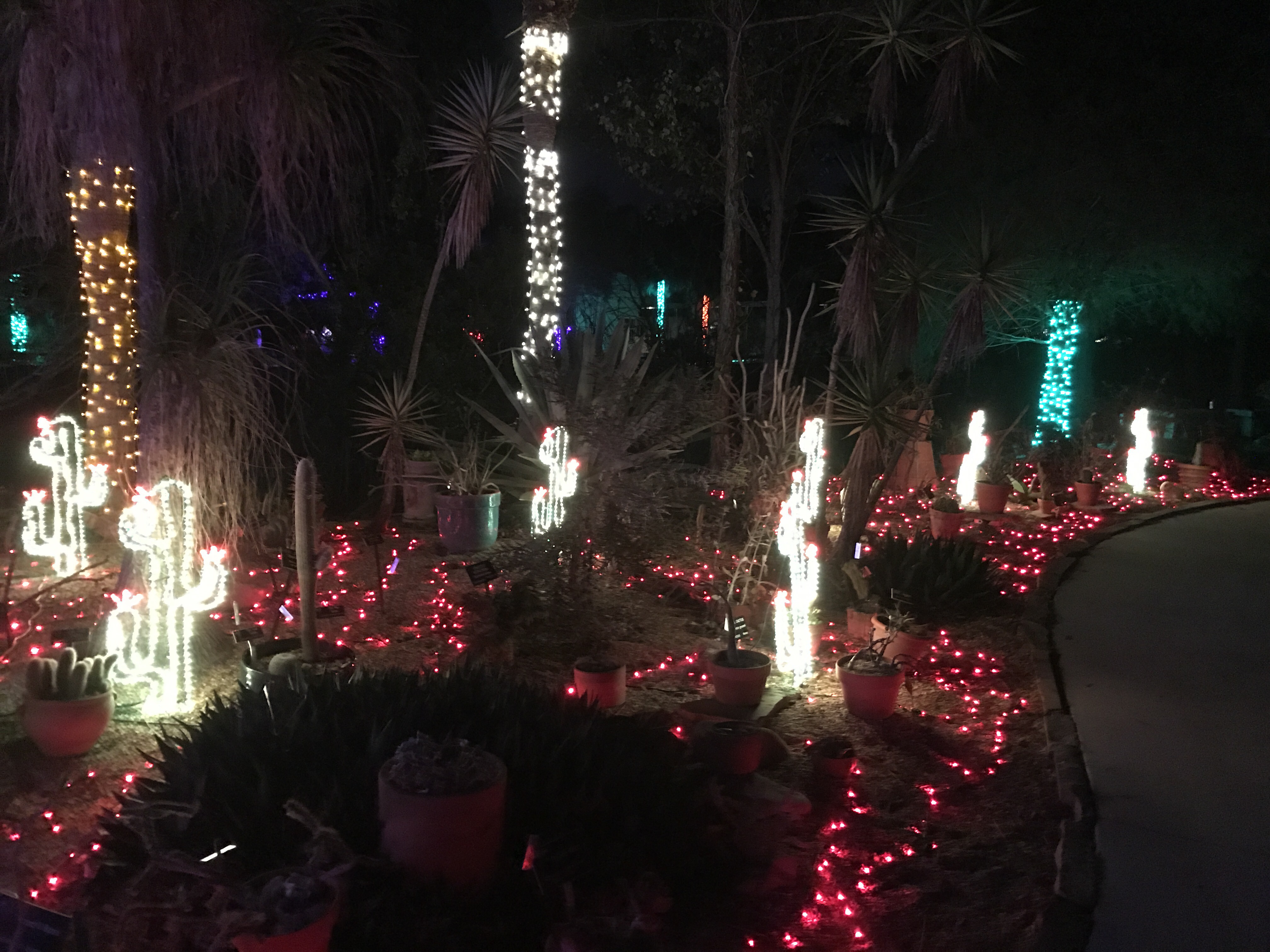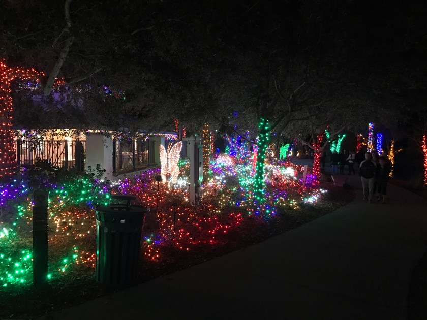 Tonight our campground neighbors and our family traveled about 15 minutes down the road to the Florida Botanical Gardens for an evening of friends and   christmas lights. The gardens were ordained with lights of every color and the pond had a laser light that illuminated the water as well as the banks around it. There was a childrens choir performing that we stopped and listened to until they finished their set of songs.  The kids got to say hi to Santa, and Pie and Bug each enjoyed a bowl of chocolate ice cream. Because what goes better with Christmas lights than ice cream. Maybe if we were further north we would consider items like hot chocolate or something, but here in FL where the dress code for the evening was jeans and t-shirts, ice cream fit the bill.