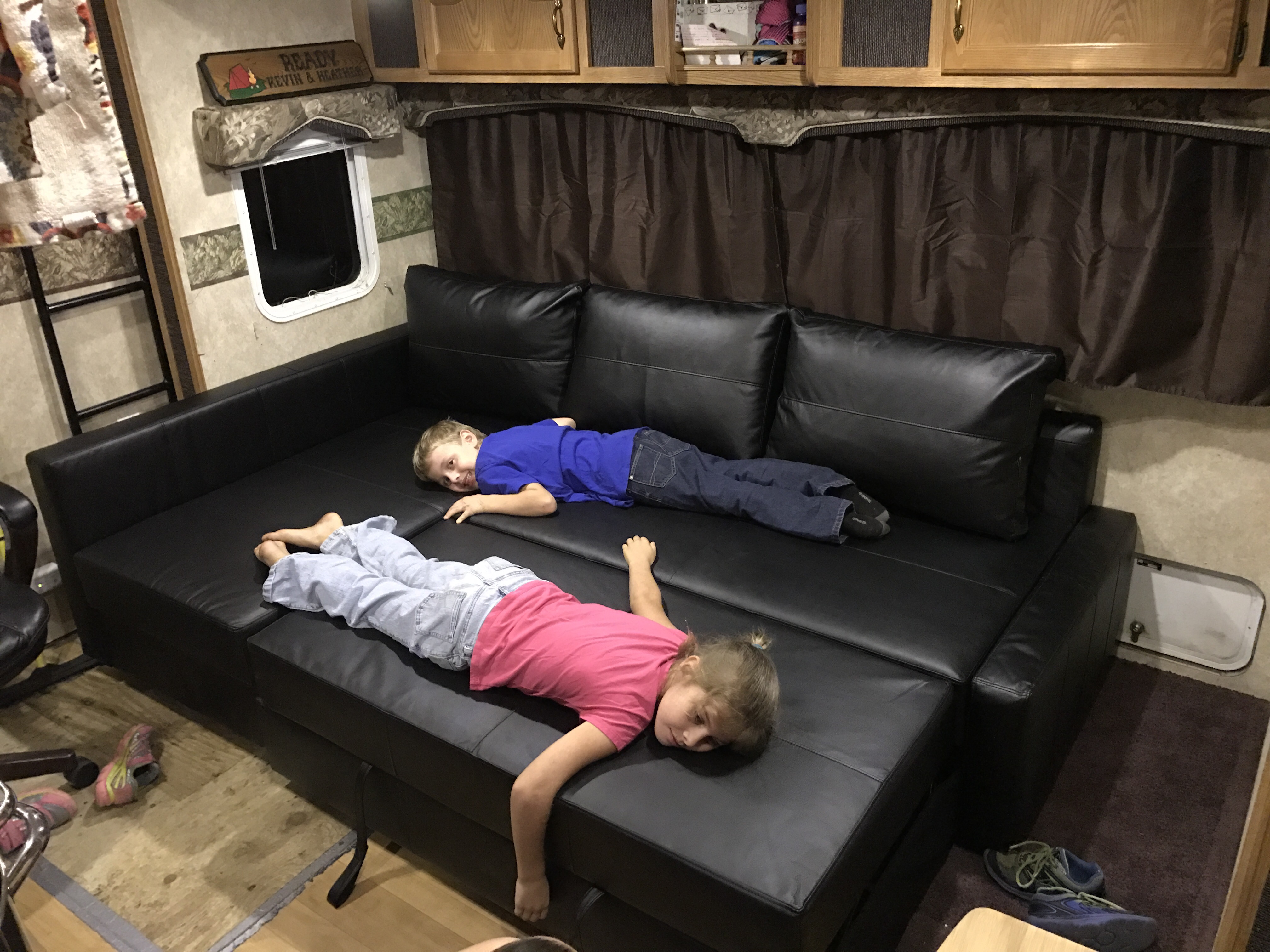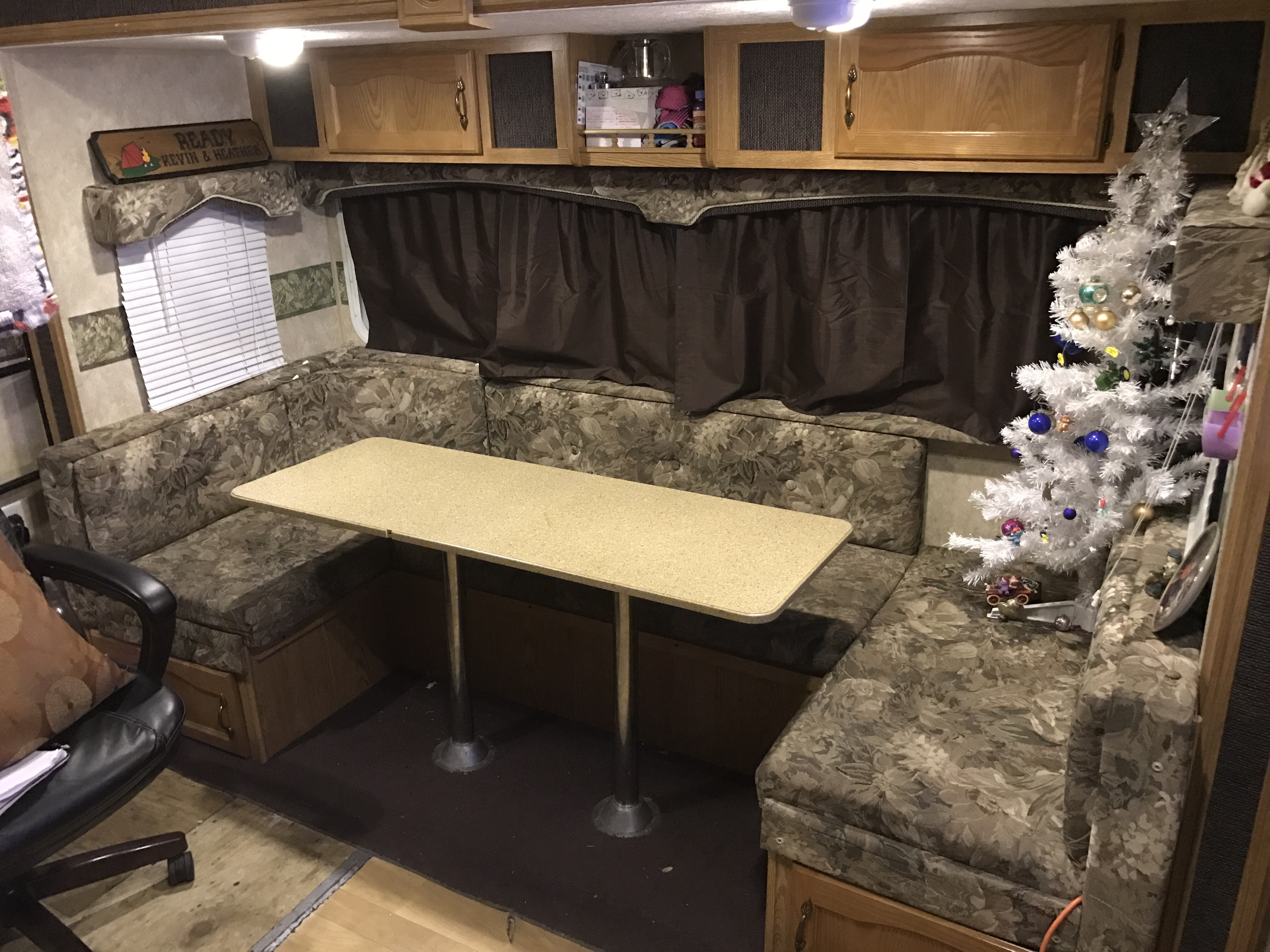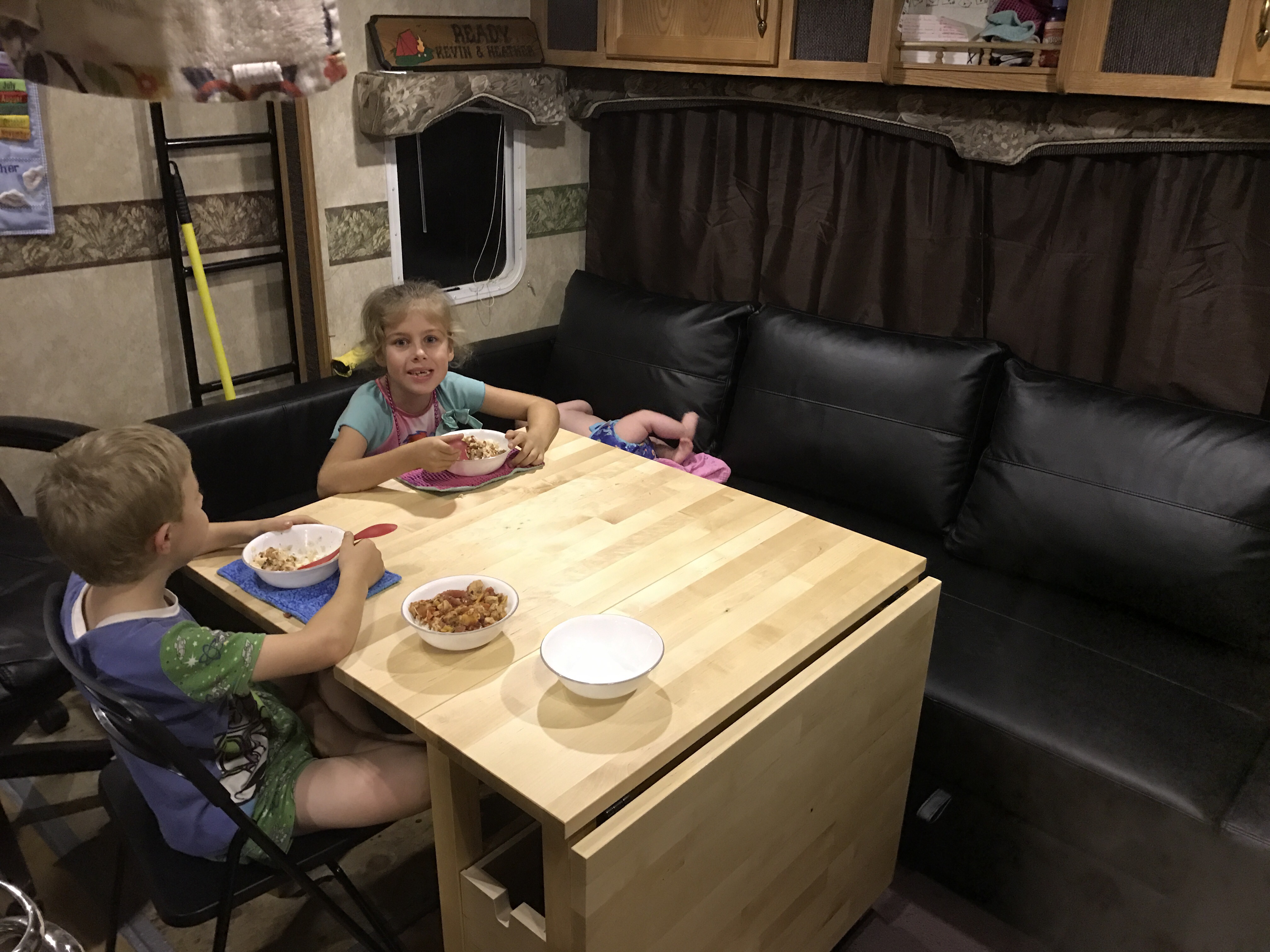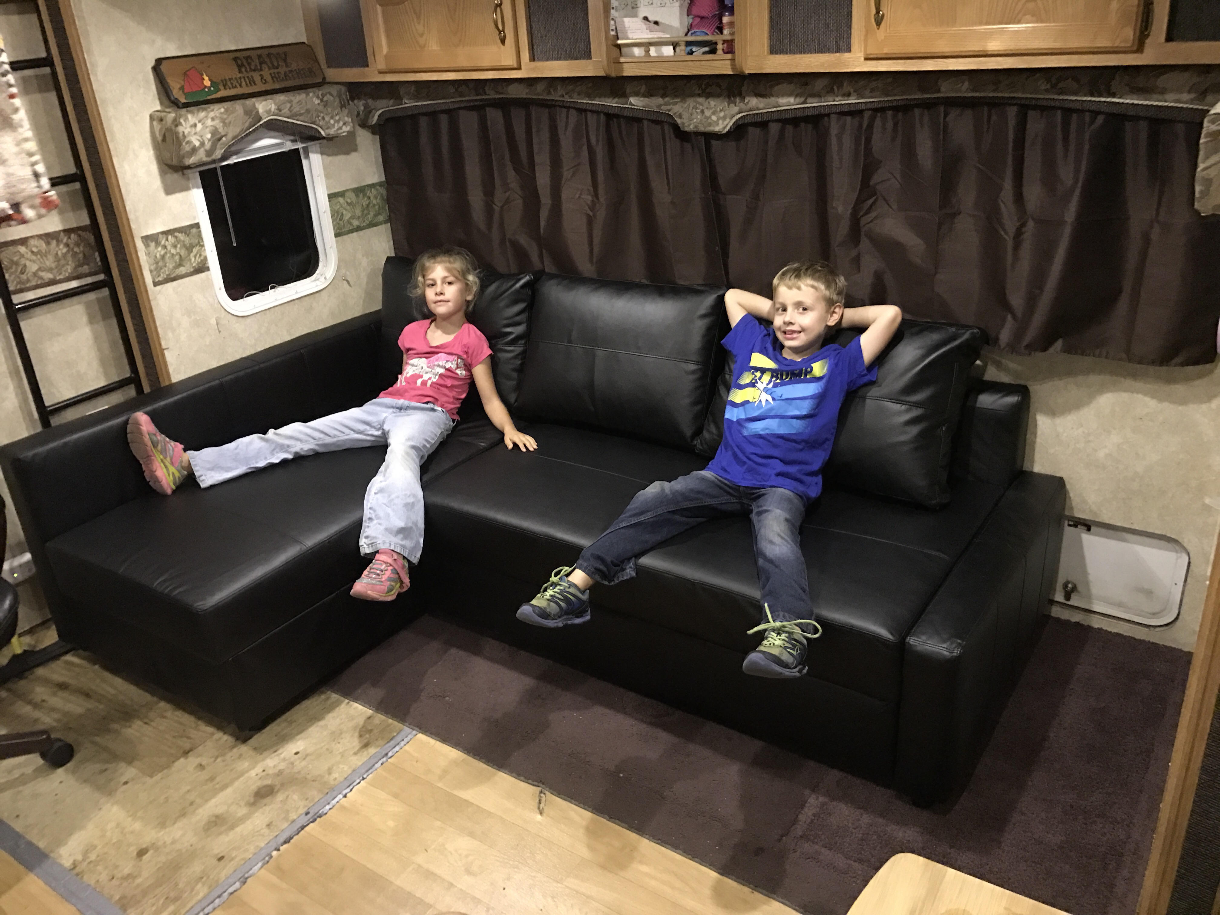 For the past year and a half we have been using the wrap-around couch and dinette that came pre-installed in the fifth wheel. The couch offered plenty of seating for our family, but like factory RV mattresses, its comfort left much to be desired compared to our residential couch we had prior to moving into the RV. The table was adequate, but whenever we had guests over for a meal the table space became quickly cramped and no place to put any food once everyone’s place settings were on the table. Heather has voiced her dislike of the current setup a few times, but we really didn’t like our options. Typically we could have a small table with 4 chairs and a loveseat, or a wrap-around like we had. The alternative option really didn’t fit the needs of our family, so we left the wrap-around in place. Our current plan is to continue the RV lifestyle for at least a few more years minimum with this fifth wheel, so we would like to have a setup that we enjoy instead of simply tolerating since it will be our home for years to come.