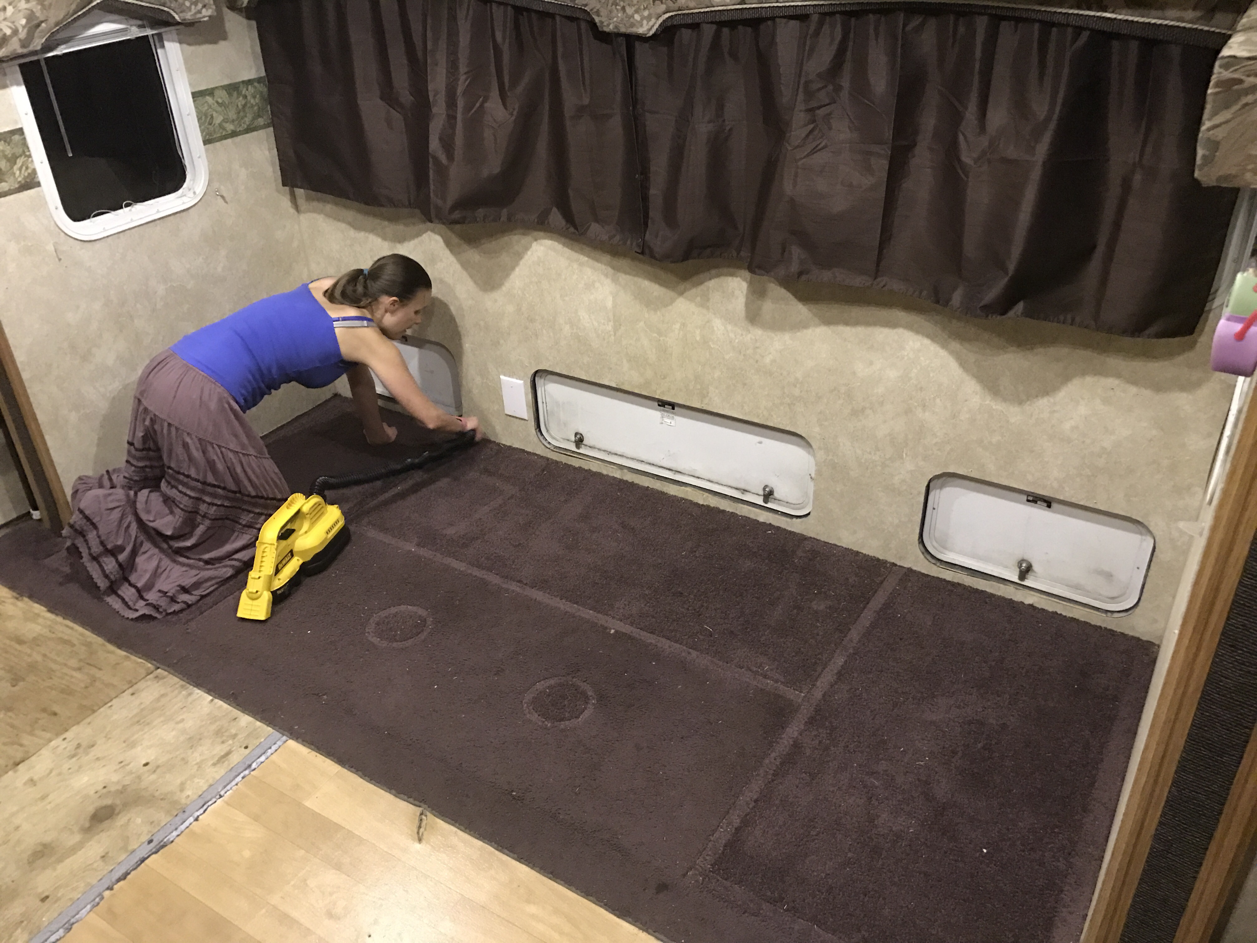 Back at home we quickly disassembled the dinette, zipping out screws and moving pieces outside. The entire disassembly of the dinette, with the assistance of Pie and Bug who were eager to help, took less than 1 hour from start to finish. The carpet was vacuumed and installation was started. We did lose some under-bench storage space in the process of the renovation, but between our recent underbelly reorganization/clean-out and the recent addition of our Annex, we can afford to lose some storage space under the dinette.
