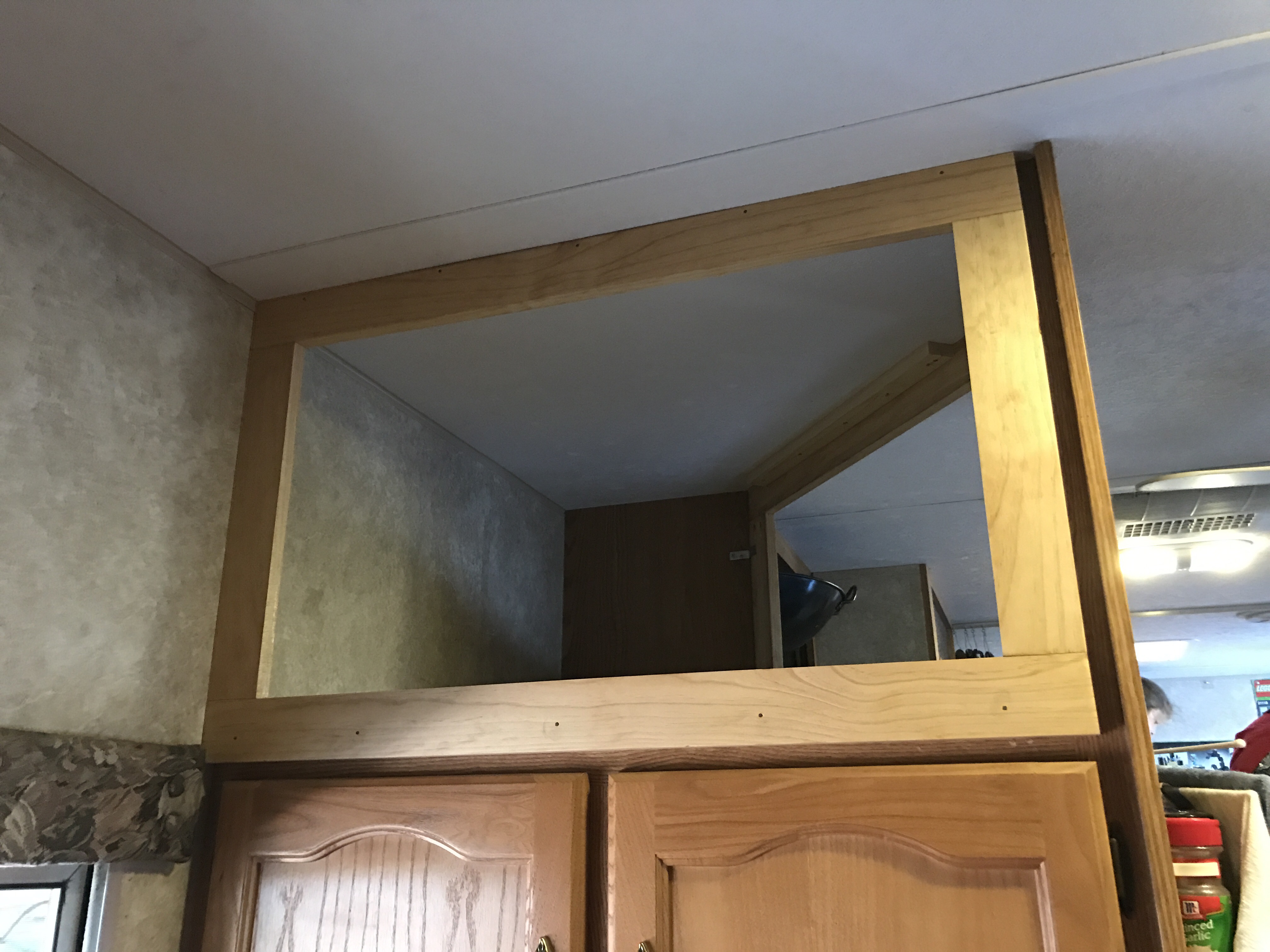 Then I began building the door frames out of pine boards for strength and aesthetic appeal. The frames are attached to the original cabinets, the wall, the new plywood cabinet floor, and the ceiling to spread the additional weight out and not overload the original cabinets.