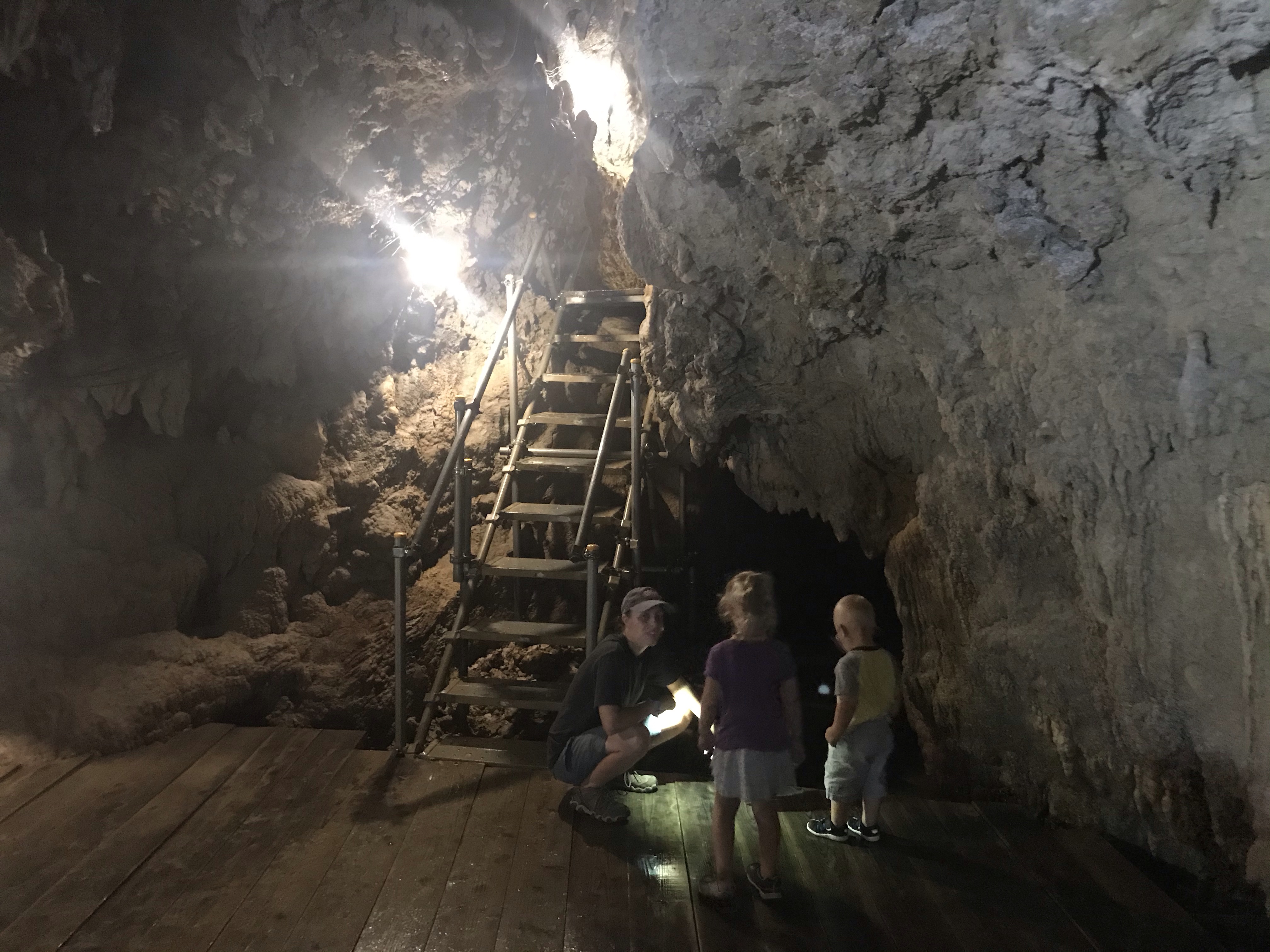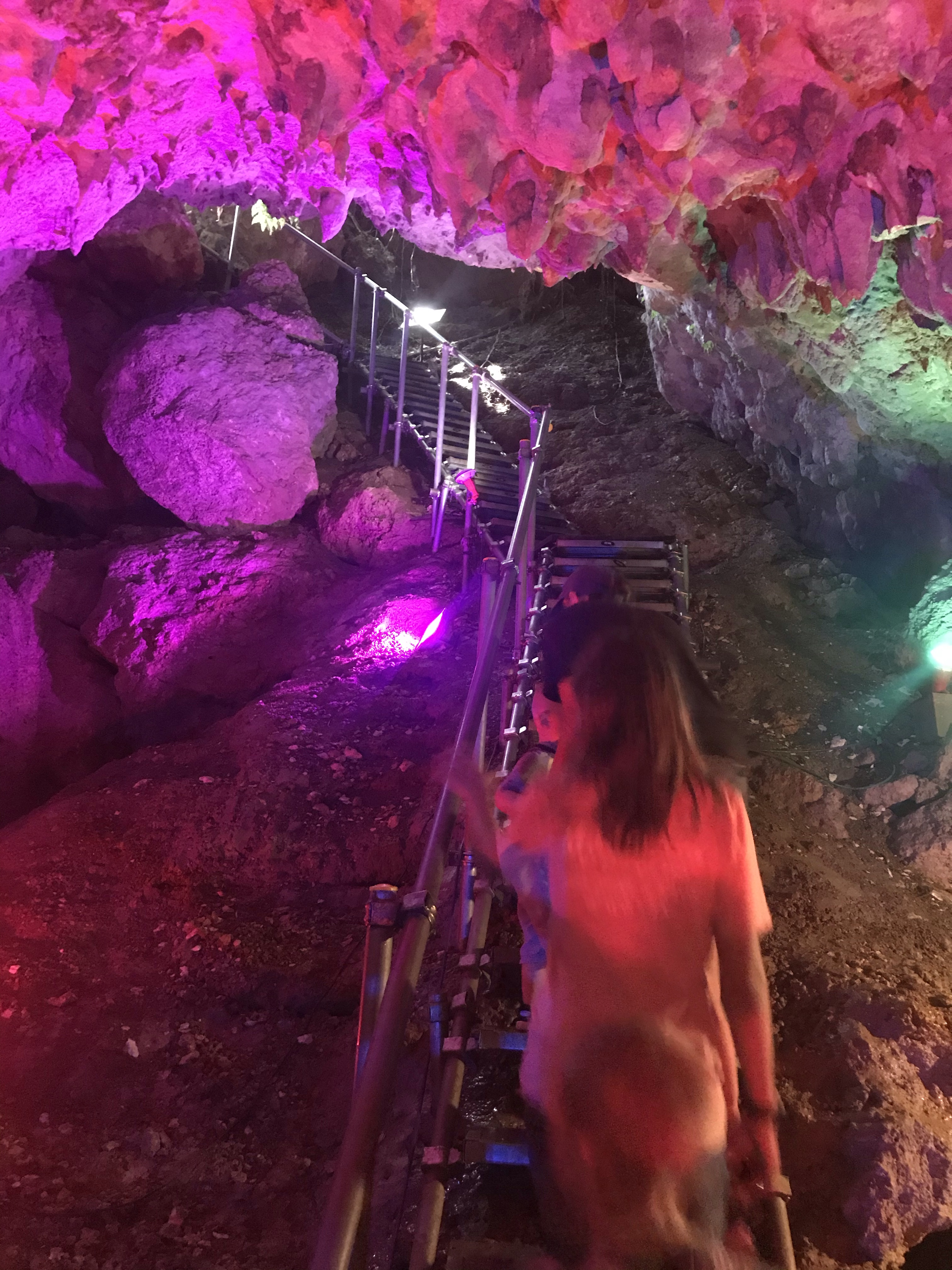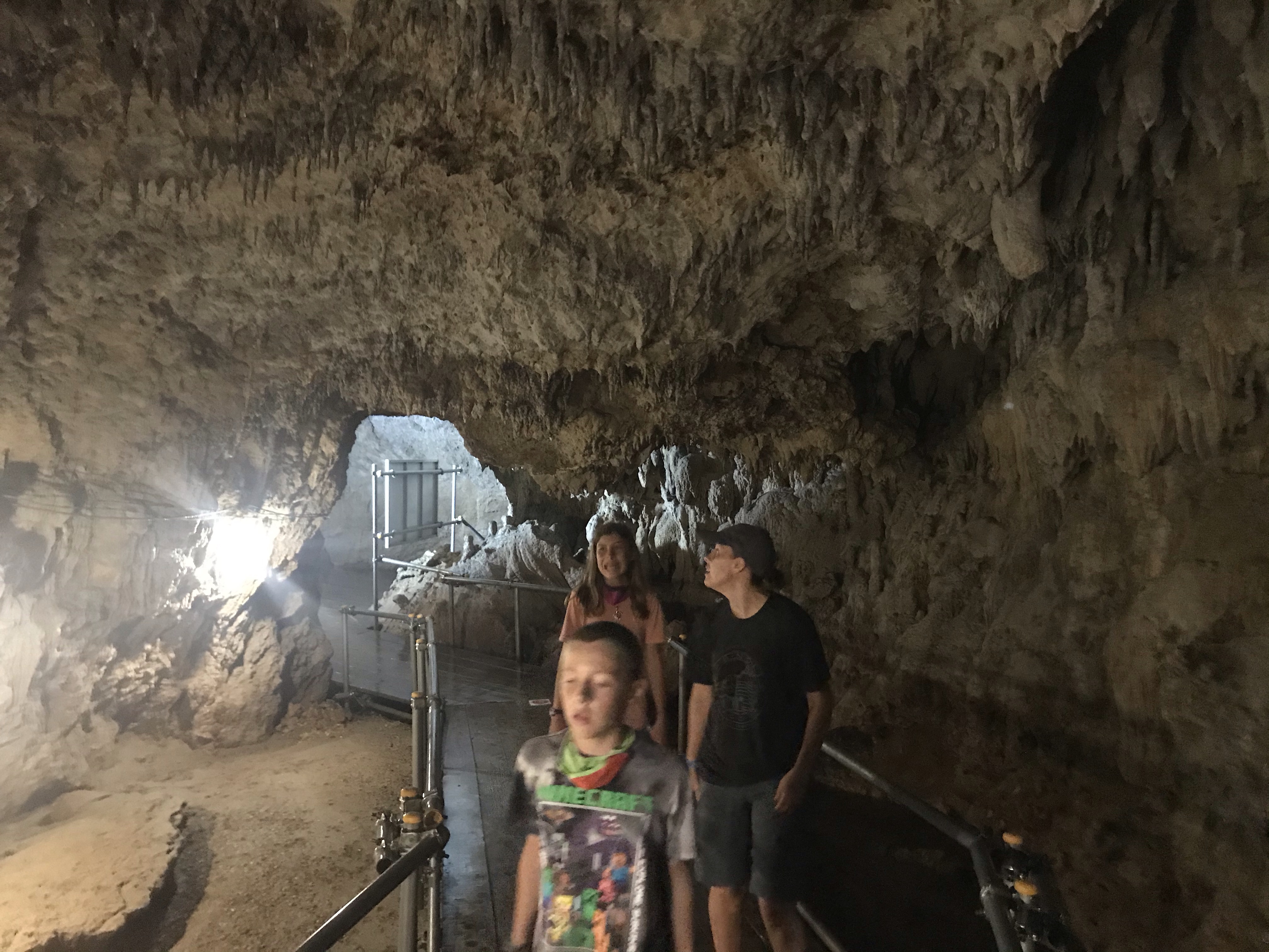 The island of Okinawa has many small caves and caverns all across the island. It is one of the geographical aspects that made it so hard for the Americans to win the battle of Okinawa during the 2nd World War.Cave Okinawa is a decent-sized natural cave in the central region of the island that extends some distance under the surrounding topography. It has 2 non-descript entrances and a steel support structure with wooden planks for visitors to tour the cave. The electric lighting is adequate, albeit rudimentary by American standards as it is a two-wire system with no grounding and the connections are a little crude (the things I notice…). There is a fast-moving stream inside the cave, so being able to walk above the water was welcomed. However, we did note the difference between what the Japanese considers safe versus what the United States would consider safe for tourist use. I do not think the rails and planks in the cave would have passed OSHA inspection. The cave was about 4 feet wide in some places, yet opened up to a great room of maybe 20 feet tall and 30 feet wide at its widest point. As with most caves, the cool damp climate of the cave was a welcome change to the heavy heat outside. The tour only took us about 30 minutes to complete, but everyone agreed it was worth the stop.