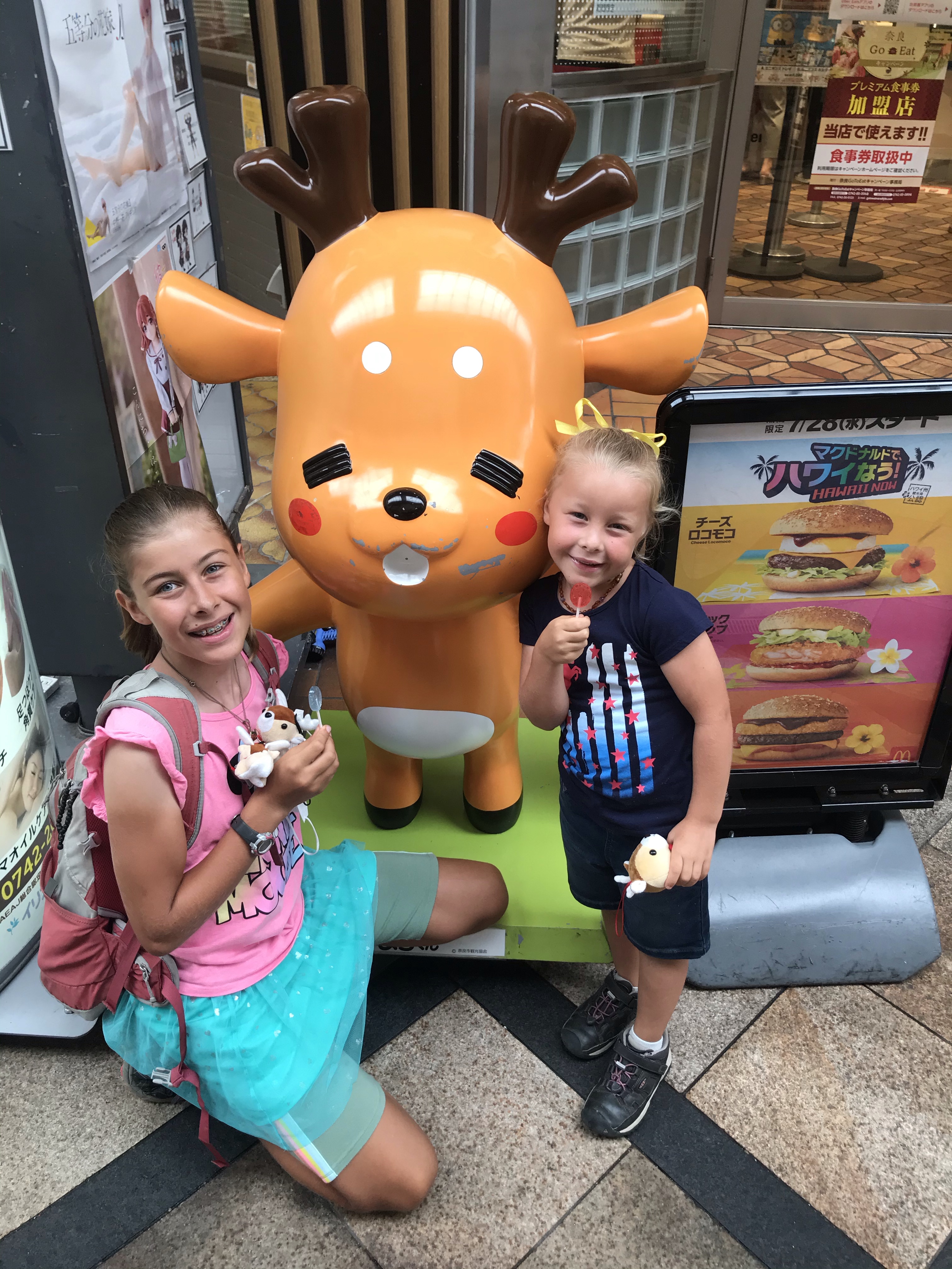 We spent a half day in Nara, a smaller town known for its wandering bowing deer population. In Japan bowing is a large part of their culture. Instead of shaking hands upon greeting someone, the Japanese bow. This has translated over to the deer as well. When the deer want fed they will approach you, bow, and then wait to be fed. Vendors along the sidewalks sell special deer “cookies” so visitors don’t feed the deer junk food. The deer roam throughout the town around grassy or tree-shaded areas. We saw one grazing along a resident’s front walk without much of a care in the world. They will walk right up to you, however some have better manners than others. One deer that we encountered had a full rack of antlers. He bowed very carefully as to not hit us with his antlers. Others are not as well behaved and were nipping at visitors’ shirts or nudging them with their heads/antlers in search of some “deer cookies”.