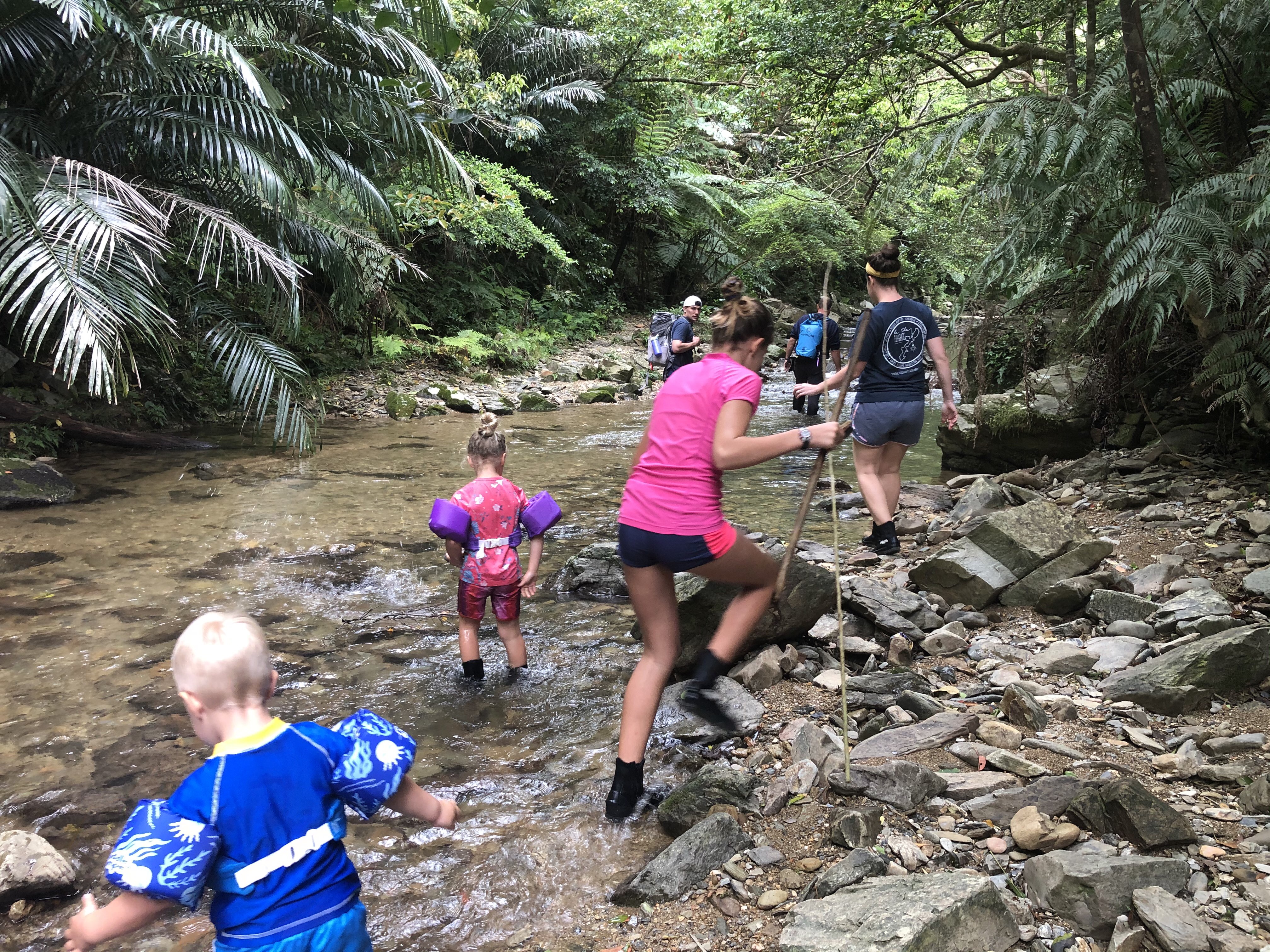 Yesterday we and some very good friends of ours went to Ta-Taki falls, a natural waterfall in northern Okinawa. Once there we walked up a small paved road to the river entrance and proceeded to river trek up the water for about 3/4 of a mile to the falls. The reviews claimed one could make it from the parking lot to the falls in 30 minutes, but with 4 children under the age of 6, our contingent was not that speedy. The river was mostly knee-deep or less with a few deeper spots that could mostly be avoided by climbing over the rocks on either side of the river. Once at the falls the smallest children were a bit chilled as the water was not the warmest on April Fools Day, which allowed the bigger kids and the young-at-heart to play with less concern for small people safety. The little people huddled under dry towels and demolished a bag of veggie straws while the big kids and parents tried out the rope swing and swimming hole at the base of the falls.